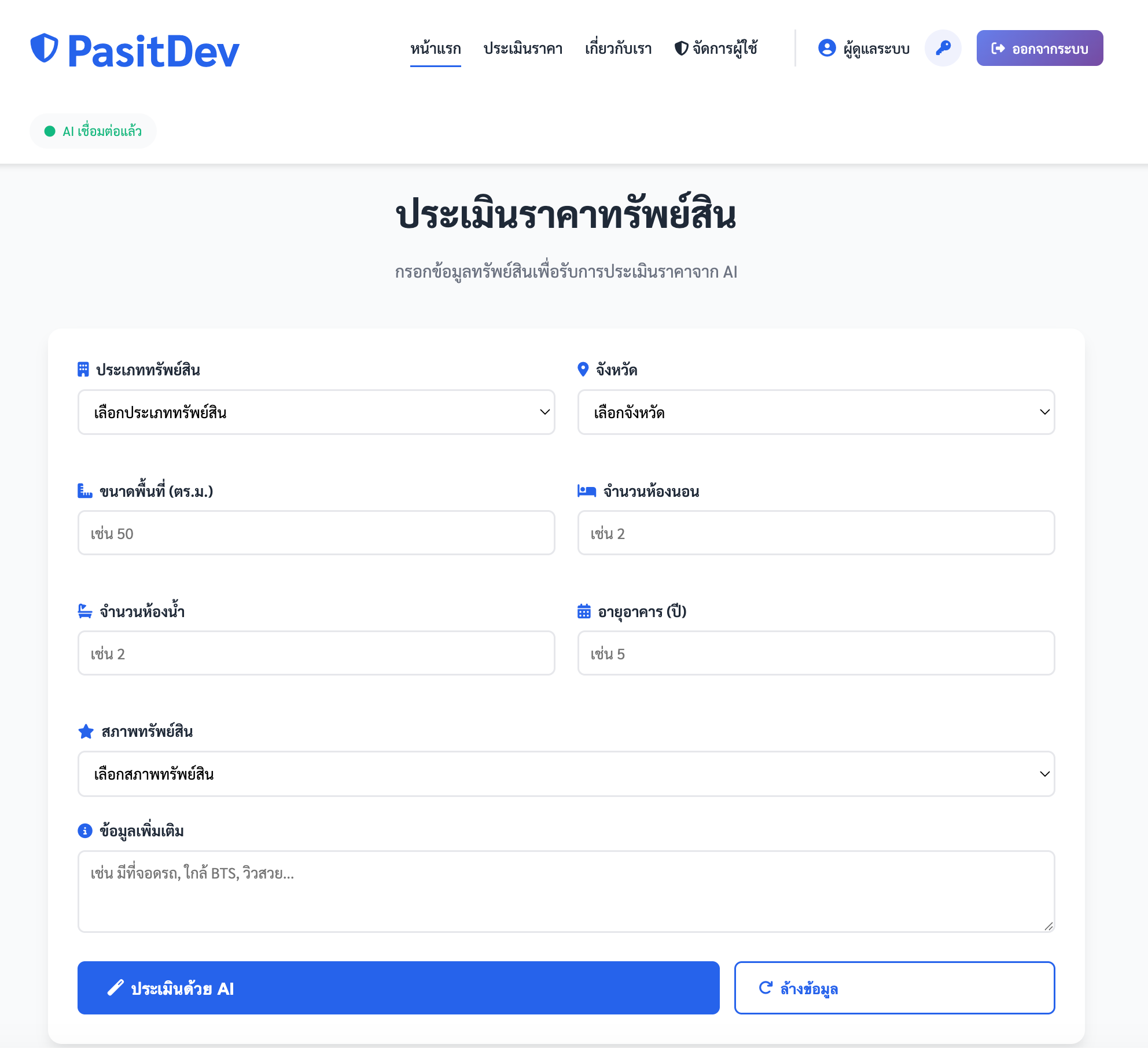 PasitDev - ระบบประเมินราคาทรัพย์สินอัจฉริยะ ระบบประเมินราคาอสังหาริมทรัพย์ด้วย AI แบบ Local ที่ใช้เทคโนโลยี Ollama AI, Flask, jQuery และ HTML5 พร้อมรองรับ 77 จังหวัดทั่วประเทศไทย และสร้าง PDF รายงานภาษาไทยได้อย่างสมบูรณ์